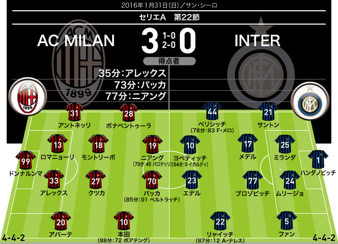本田が先制点をアシスト ミランがインテルに3点差を付けてダービー快勝 サッカーダイジェストweb
